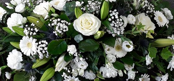 All white casket with mixed flowers 4ft