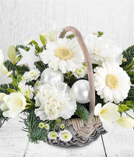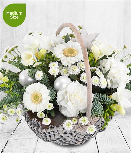 Germini Chrysanthemums and Carnations combine to make this a very pretty white Christmas flower Basket.